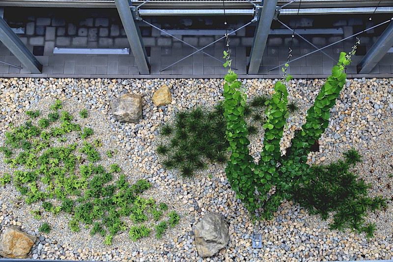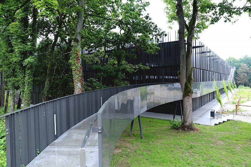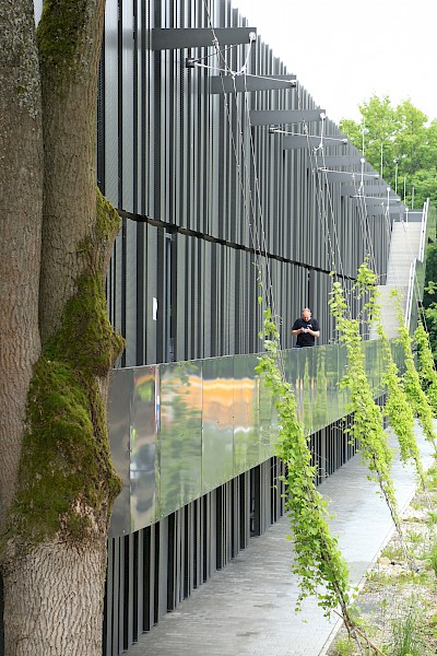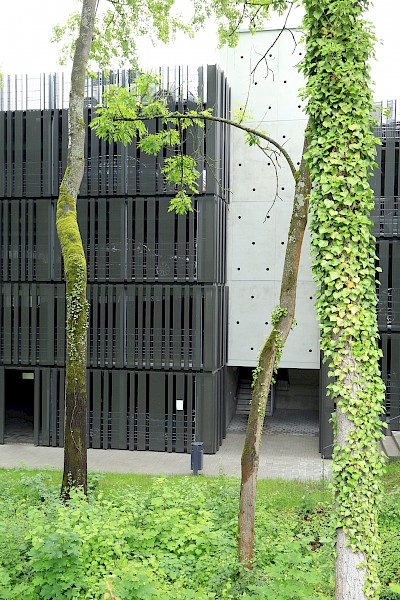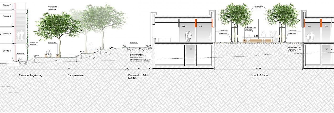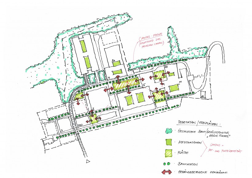 Auf einer Lichtung gelegen, ist das Baugrundstück in einen wertvollen Waldbestand eingebettet. Topografisch bedeutsam ist der Geländeverlauf nach Norden und Westen mit einem Höhenunterschied von ca. 7 m. Die Freianlagen der neuen Gebäudeteile umfassen eine Gesamtfläche von rund 2,5 ha und sind in verschiedene Funktionsbereiche gegliedert. Neben den repräsentativen und nutzungsintensiven Bereichen wie Vorplatz, Innenhof, Nordterrasse und Mensaplatz werden auch rein funktionale Bereiche wie ein Andienungshof, Waldsaumbereiche und Wegebeziehungen hergestellt. Die Dachflächen des Neubaus werden mit intensiven und extensiven Dachbegrünungen gestaltet. Mit dem von Gehölzen gerahmten Mensaplatz werden den Studenten zentrale Sitz- und Liegezonen mit Anbindung an einen WLAN-Hot-Spot geboten. Bei Bedarf kann der Mensaplatz als Veranstaltungsfläche genutzt werden.