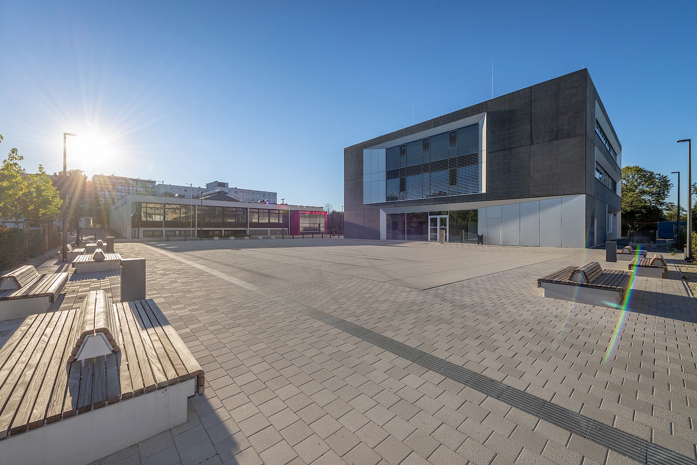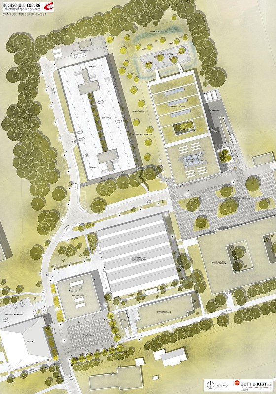 Der Freistaat Bayern plant auf dem Hauptgelände der Hochschule Coburg ein neues Zentralgebäude mit Rechenzentrum und Bibliothek sowie für zentrale Verwaltungsaufgaben. Aus dem Wettbewerbsverfahren mit anschließendem VOF-Verfahren gingen AV1 Architekten gemeinsam mit HDK Dutt & Kist als Sieger hervor. Im Nachgang erfolgte auf Basis eines Rahmenplanes die Beauftragung zur Gestaltung des Parkhauses und des Mensaplatzes.