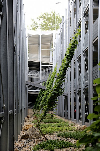 Das Heranrücken des Gebäudes direkt an das „Campusforum“ schafft einen gut proportionierten Platz, so dass eine neue Mitte entsteht. Die Entscheidung das Parkdeck nach Norden abzurücken ermöglicht es das neue Gebäude wirkungsvoll zu inszenieren. Die Durcharbeitung der Freiflächen, insbesondere auch die Auseinandersetzung mit den nördlich angrenzenden Flächen zeigt, dass die Verfasser ein Gesamtkonzept entwickelt haben, das auf die Bedürfnisse einer Hochschule eingeht.