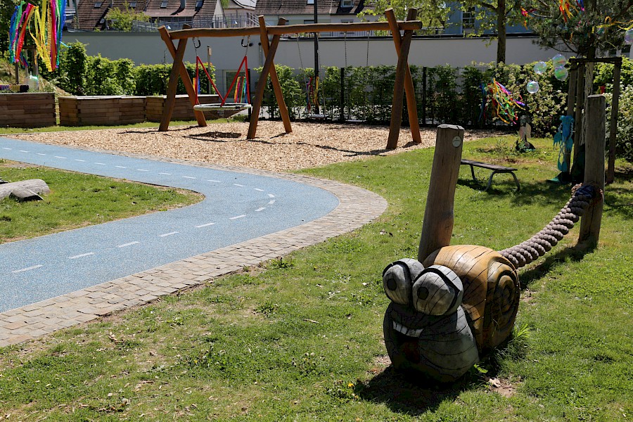 Inspiriert vom Leitbild des Schneckenhauses ist im Außenraum eine naturnahe Spiellandschaft mit vielfältigen Bewegungs- und Rückzugsräumen für Kinder jeden Alters entstanden. Die Gestaltungsgrundlage entstand hierbei bereits im Rahmen des Wettbewerbsverfahrens im Jahre 2019.