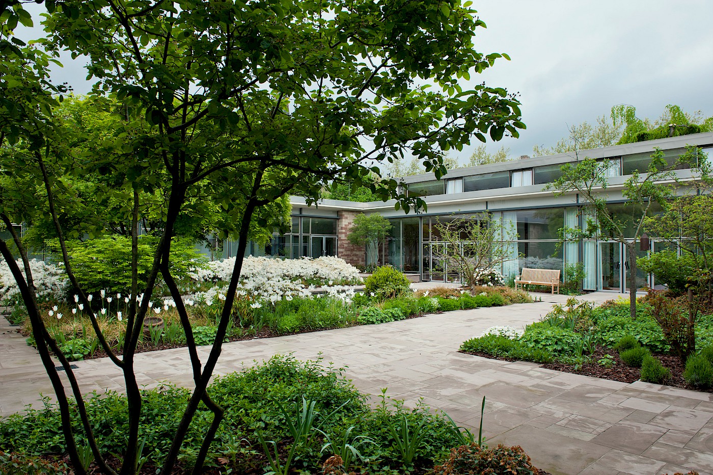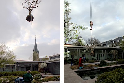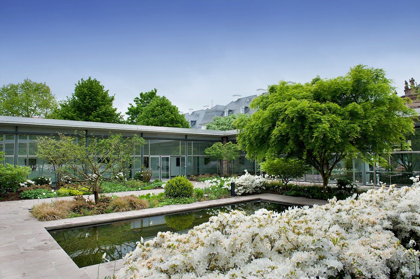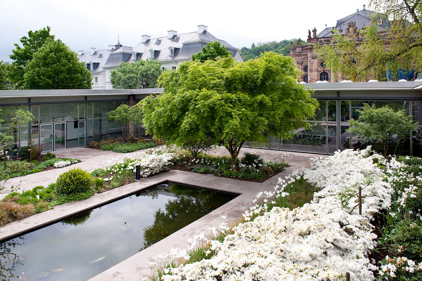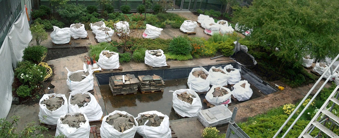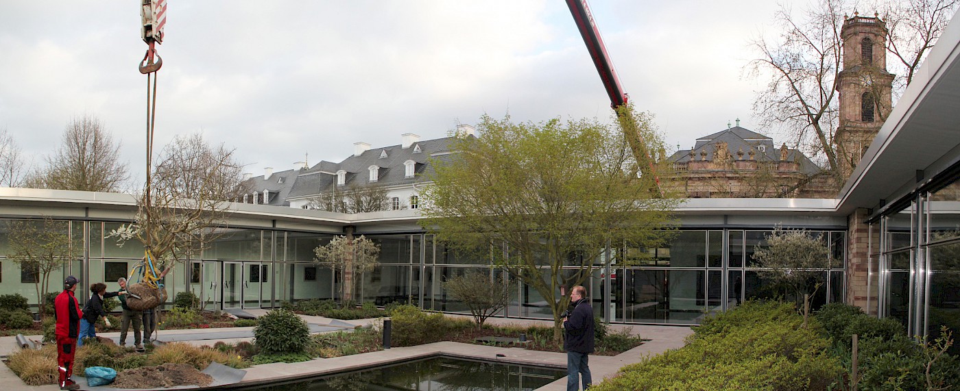 Inspiration zur denkmalgerechten Sanierung konnte durch historische Bildaufnahmen gewonnen werden. Hieraus ließen sich die originalgetreuen Motive der Pflanzen- und Materialverwendung ableiten. Die Sandsteinbeläge wurden nach historischem Vorbild im Römischen Verband hergestellt; Treppen und Mauern ebenfalls nach denkmalpflegerischen Aspekten restauriert. Das Wasserbecken und dessen Technik wurden modernisiert und unter Flur gesetzt. Beleuchtung und Stromversorgung im Innenhof wurden an die Bedürfnisse der Nutzer angepasst sowie die vorhandene Bepflanzung mit mehrstämmigen Schirmgehölzen und einer gärtnerischen Anreicherung aus Kleingehölzen, Stauden, Gräsern und Zwiebelpflanzen ergänzt. Über die Jahre hinzugekommene, denkmalpflegerisch nicht nachvollziehbare Elemente wurden entfernt.