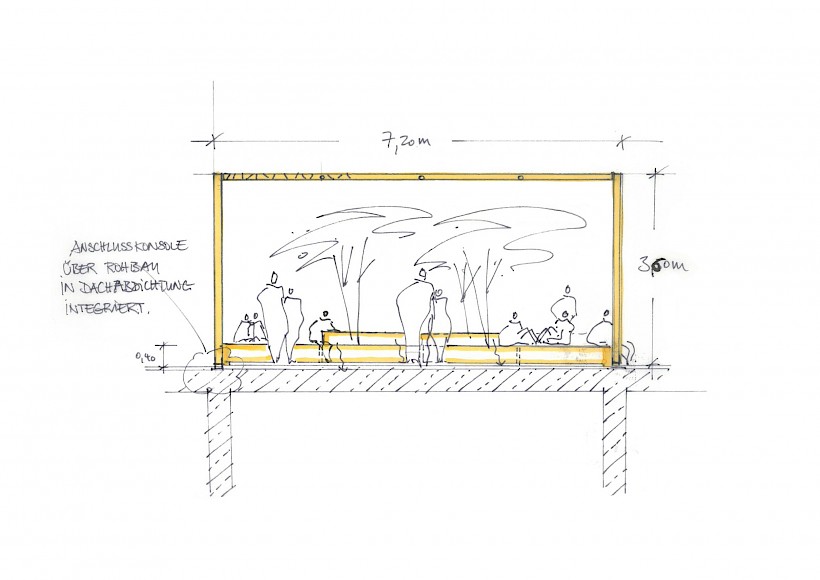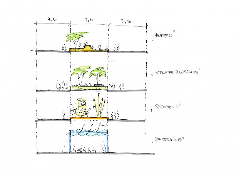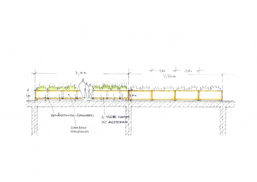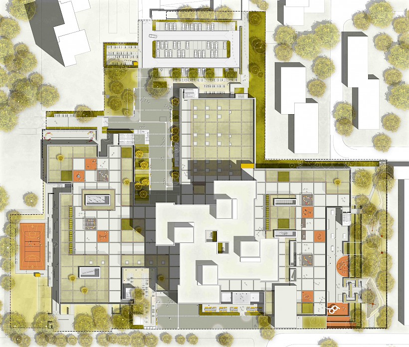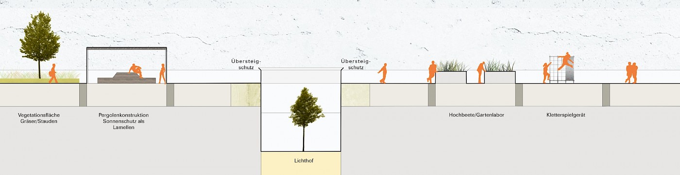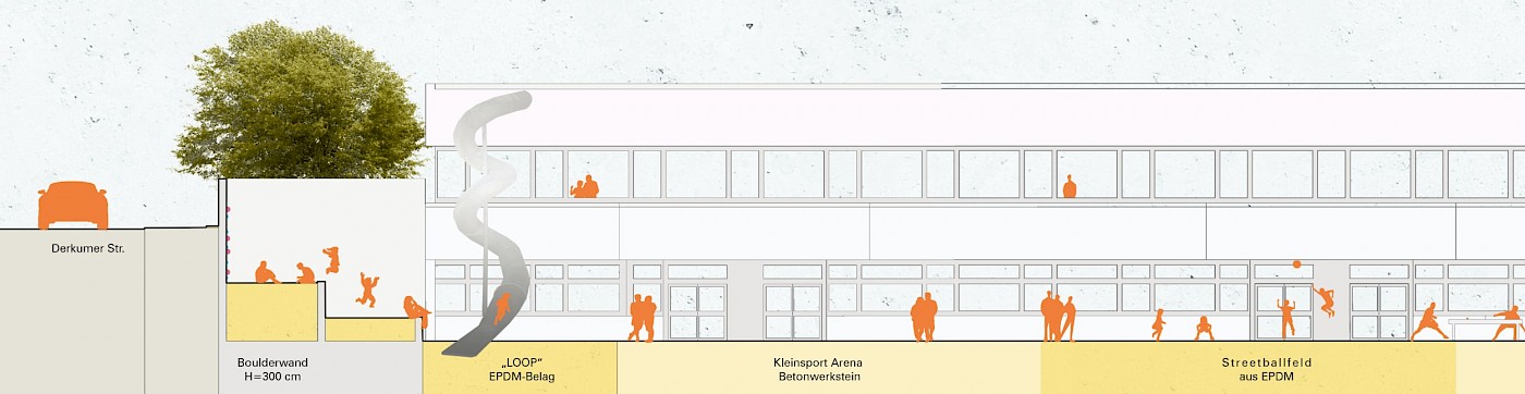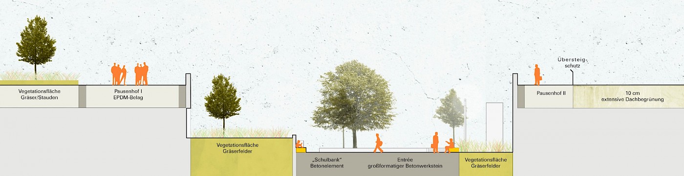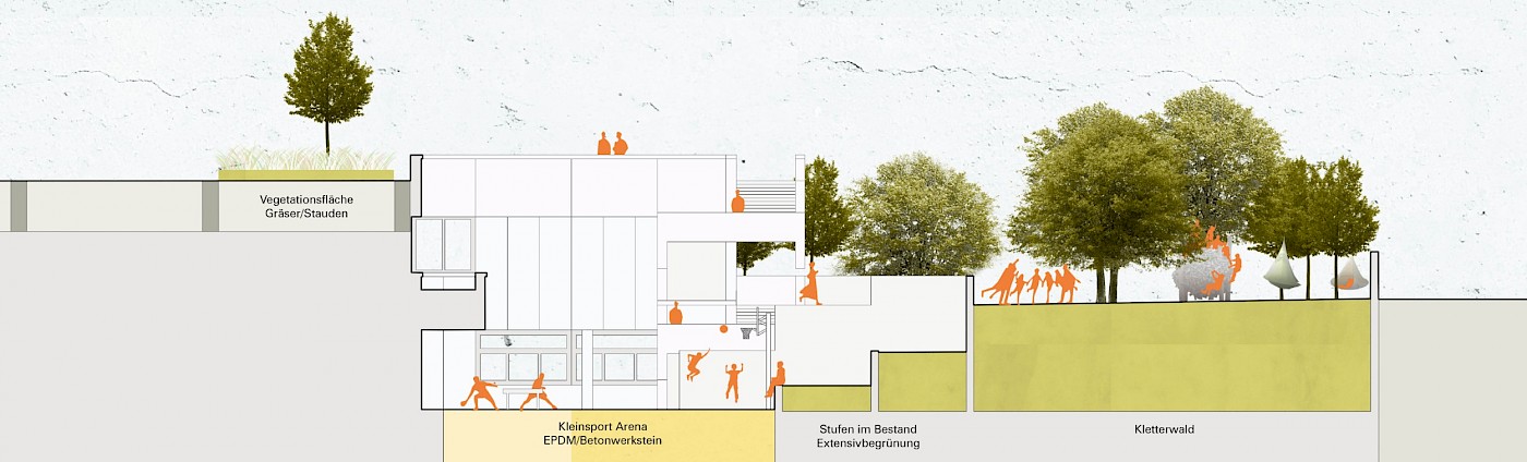 Durch Aktivierung der rund 12.000 m² großen Dachfläche über dem Erdgeschoss, entsteht eine neue Fläche mit Spiel- und Bewegungsangeboten in qualitätvoller Gestaltung für die rund 1.300 Schüler.