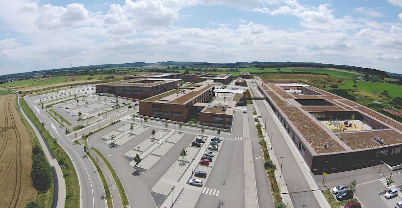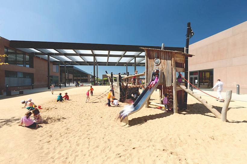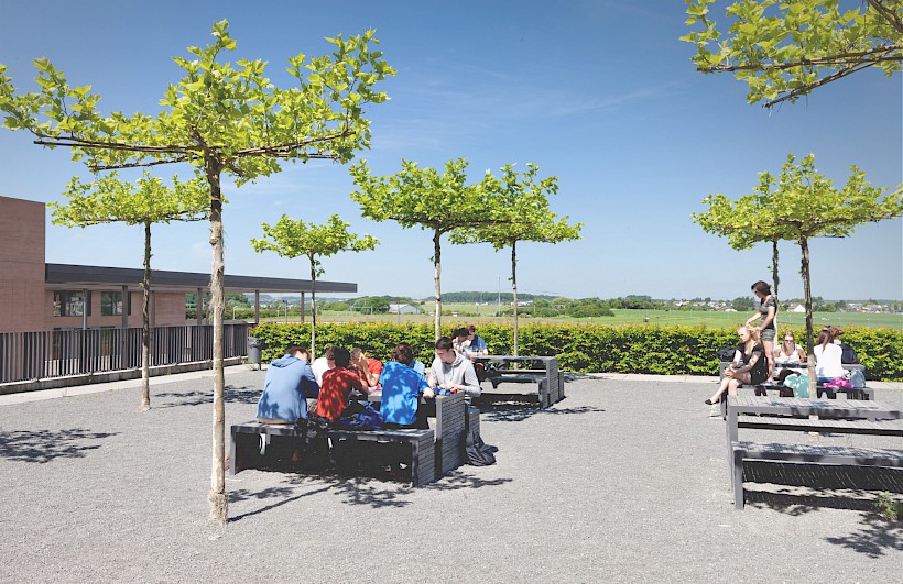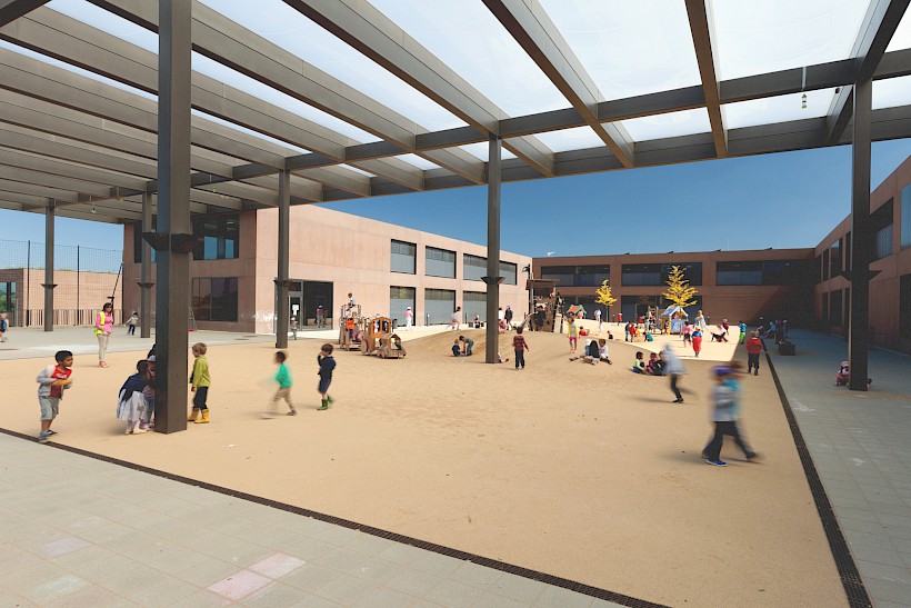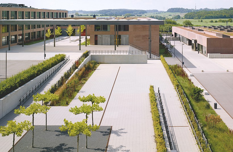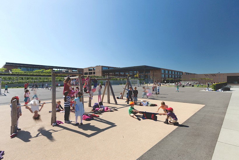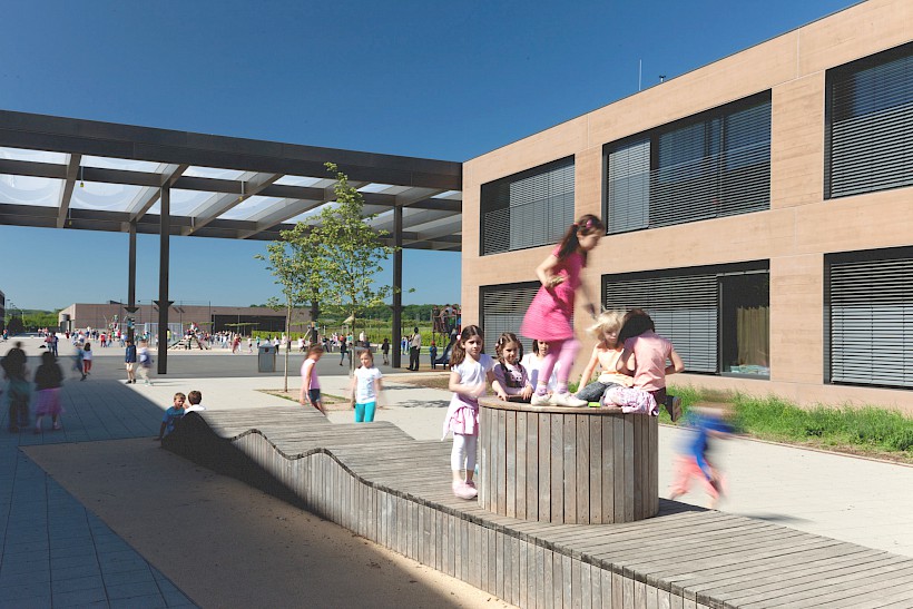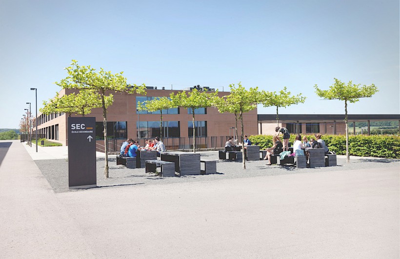 Eingebettet in die weichen Hügel des Grüngürtels der Stadt Luxemburg schmiegt sich der Schulkomplex minutiös an die Höhenlinien der Landschaft. Es entwickelt sich ein Wechselspiel der Baukörper mit den Freiflächen, die sich in regelmäßigen Terrassen V-förmig über eine Höhe von ca. 11,50 m zum Tal hin öffnen. Dabei verzahnen sich Gebäuderiegel und Schulhofebenen über wiederkehrende Freitreppen und Stützwände zu einer großartigen Terrassenlandschaft, die ganz im Sinne des ausgezeichneten Architektenentwurfs prägend für die Gesamtanlage ist. Die begrünten Dachflächen, welche aufgrund der Höhenstaffelung teilweise einsehbar sind, unterstützen durch den bandartigen Wechsel zwischen verschiedenen Farbnuancen der Pflanzenauswahl und mineralischen Flächen als 5. Fassade die Struktur des Gesamtkomplexes. Haupt- und Zwischenterrassen können jeweils einer Organisationseinheit der Schule zugeordnet werden, was den organisatorischen Betrieb der Schule hinsichtlich der Trennung von Altersstufen und der Aufsichtsverpflichtung unterstützt. Introvertierte Höfe mit einem speziellen, der Altersstufe angepassten Angebot an Rückzugs-, Spiel- und Sportmöglichkeiten öffnen sich zur gemeinsamen Mitte. Große Flugdächer bieten Wetterschutz und vermitteln die Wahrnehmung zwischen Innen- und Außenraum.