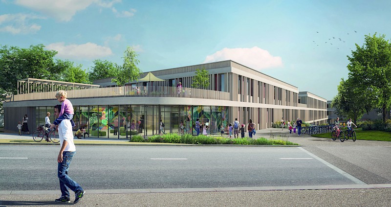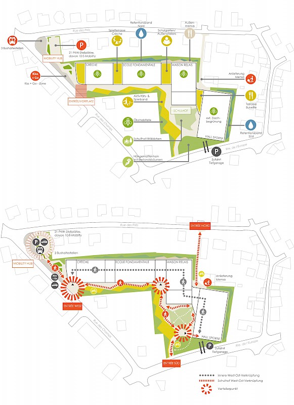 Das neue Entrée an den Neubaugebäuden Crèche und Ecole Fondamentale, das direkt an den Mobility Hub anschließt, wird als besonderer Blick- und Bezugspunkt herausgearbeitet. Von dort aus kann das Maison Relais sowie die neue Hall Sportif entweder überdacht durch die bauliche Verknüpfung der Gebäude oder entlang des Spiel- & Aktivitätsbandes auf dem Schulhof erreicht werden.