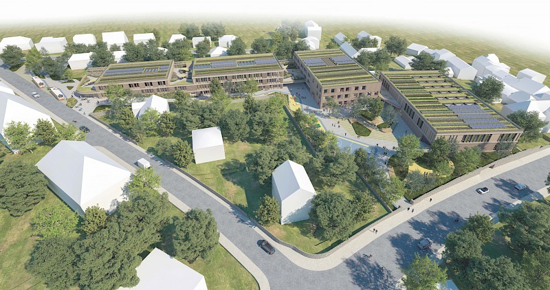 Durch den großflächigen Erhalt der Bestandsbäume im Süden und die Anordnung der Campusgebäude entsteht eine hochwertige Raumqualitäten für den Schulhof und es werden eindeutige Sichtachsen und Verteilerpunkte nachvollziehbar.