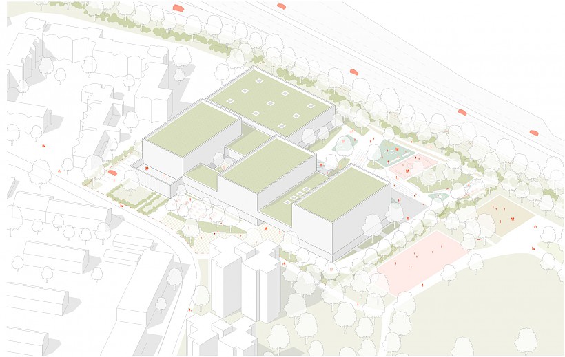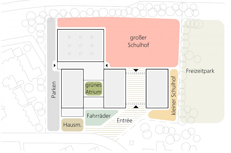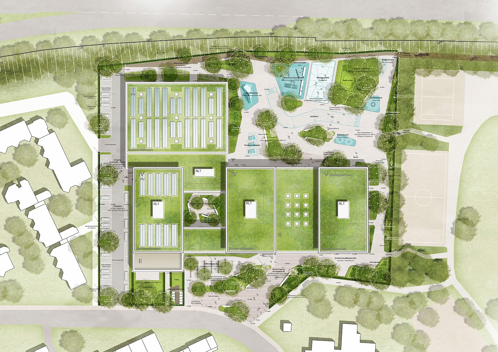 Die gesamte, der Erschließung dienenden Infrastruktur (Zufahrt, Anlieferung Mensa, Stellplätze PKW) wird auf der Westseite des Baufeldes organisiert. Hierzu wird die bereits bestehende Erschließung des Kindergartens genutzt und ausgebaut. Die PKW-Stellplätze werden auf einem grün eingefassten Parkplatz gebündelt - von der Straße unsichtbar, weil abgewandt. Von hier aus wird auch die direkte Erschließung der Sporthalle ermöglicht.