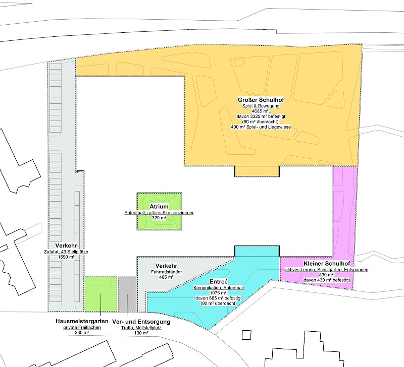Der Schulhof strukturiert sich in seiner Dynamik von Nutzungsbereichen mit lautem, aktivem Spiel, Sport und Toben bis hin zu ruhigeren Zonen der introvertierten Kommunikation und der Entspannung. Zu diesem Zweck sind auf dem Haupthof großzügige Bewegungsflächen vorgesehen, die in kleineren Ausstattungsbereichen Außenkicker, Tischtennisplatten, Boulderwand, Calisthenics und ein Multi-Funktionssportfeld anbieten und auf der Ostseite des Schulgebäudes in einen Spiel-Parkour mit zahlreichen Hüpf- und Balancierspielen übergehen. Auf der östlichen bzw. süd-östlichen Seite des Grundstücks soll sich der Anteil der befestigten Flächen reduzieren. Das Schulhofband bildet hier Taschen, in denen geräuscharme Nutzungen angeordnet werden, die von der Orientierung und der Verzahnung mit dem angrenzenden Freizeitpark Heerdt in seiner Grünraumqualität profitieren. Abgewandt von der Geräuschkulisse der Autobahn führt der Weg vorbei an einer naturnah und extensiv gestalteten Lichtung, die zukünftig als Schulgarten genutzt werden kann. Umlaufend ergibt sich so ein Große-Pause-Rundweg, der als Spazierweg durch alle Funktionsbereiche führt und den konzeptionellen Gedanken der zirkulierenden Dynamik des Schulhofes abschließt.