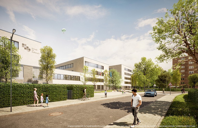 Diese effiziente Anordnung erlaubt es, den wesentlichen Teil des Straßenanschlusses des Baufeldes dem Eingangsbereich der Schule zuzuordnen. Gut sichtbar und in seiner Geometrie einladend wird im Kurvenbereich der Aldekerkstraße ein repräsentatives Entrée geschaffen, welches als Durchgangszone den Eingangsbereich des Schulgebäudes bis zum rückwärtigen Schulhof durchspült. Dieser räumliche Kontext wird durch die Materialwahl verstärkt.