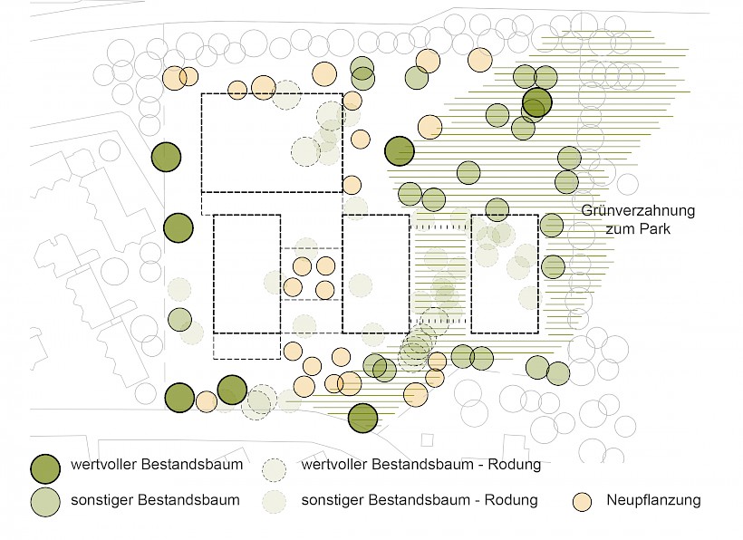 Mit dem, auf dem Grundstück vorgegebenen Baufeld wird ein vollständiger Erhalt des üppigen Baumbestandes zwar nicht umsetzbar sein, dennoch ermöglicht der Entwurf, vorbehaltlich der weiteren Detailplanung, den Erhalt von zahlreichen als erhaltenswert gekennzeichneten Bestandsbäumen und eine Integration von weiteren Bestandsgehölzen, sofern dieses in Bezug auf Art, Habitus und Zustand einen Mehrwert darstellen.