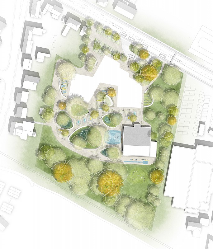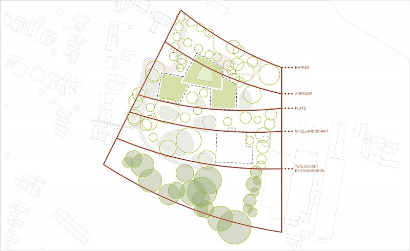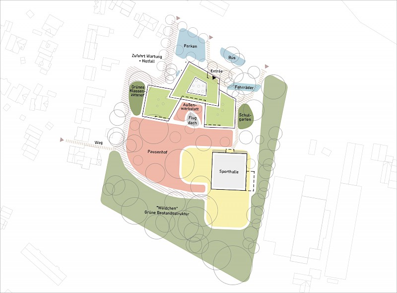 Funktionale Zonierung des Schulcampus mit einladender Adressbildung zum öffentlichen Raum. Förderung der Interferenz zwischen Pausenhoflandschaft und dem umgebenden Wäldchen.