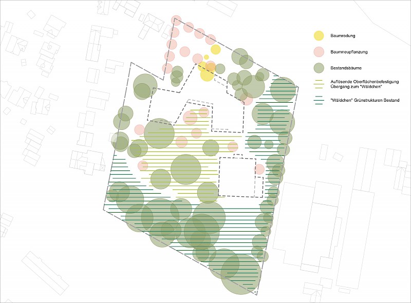 Maximaler Erhalt des vorhandenen Gehölzbestandes. Ergänzungspflanzung zur Vervollständigung des grünen Saumes. Verbesserung der Ökobilanz durch Teilentsiegelung der Schulhofflächen und Minimierung des neuen Versieglungsgrades.