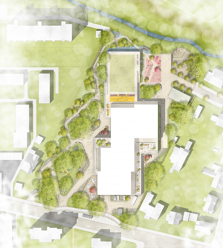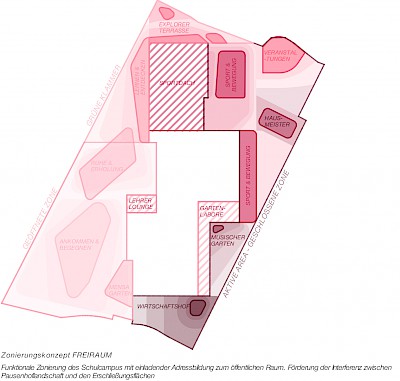 Funktionale Zonierung des Schulcampus mit einladender Adressbildung zum öffentlichen Raum. Förderung der Interferenz zwischen Pausenhoflandschaft und den Erschließungsflächen