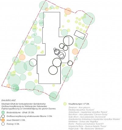 Maximaler Erhalt der konturgebenden Gehölzstruktur. Großbaumverpflanzung zur Wahrung des Naturwertes. Ergänzungspflanzung zur Vervollständigung des grünen Saumes.