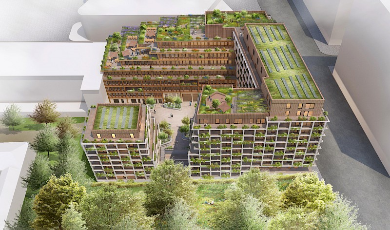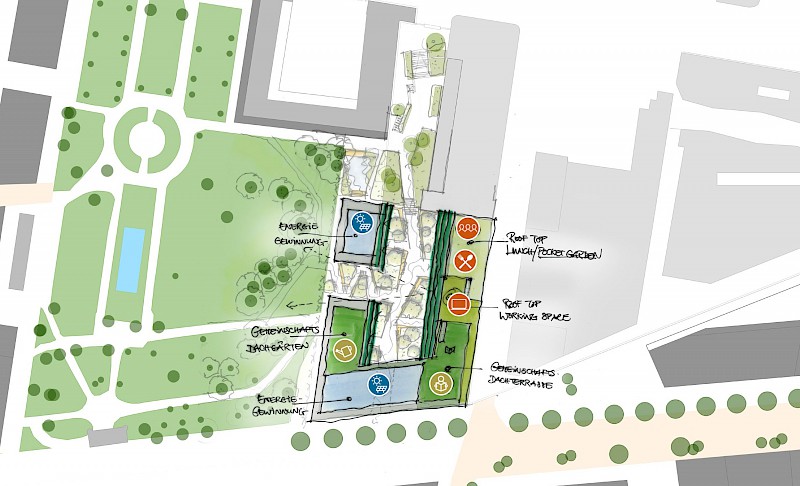 Die Dachlandschaft ist neben dem Innenhof die Hauptfreifläche für die Bewohner*innen und Mitarbeiter*innen des Neubaus. Durch die räumliche Staffelung zum Landewyckgebäude wird die Dachterrasse baulich und nutzungsspezifisch zoniert – durch die vielschichtigen Nutzungen entsteht dadurch eine Multicodierung der Dachlandschaft. Das 4. bis 6. Obergeschoss wird den Büroflächen zugeordnet. Auf diesen Ebenen befinden sich Bereiche für die Mittags- oder Zigarettenpause, zum Arbeiten unter freiem Himmel oder lediglich zum kurzen Entspannen. Auf dem 7. und 8. Obergeschoss befinden sich die Bereiche für die Anwohner*innen des Gebäudes. Dort befindet sich Aufenthaltsmöglichkeiten zum Entspannen und Zurückziehen, diverse Spielangebote, Bereiche zum Gärtnern und ein Platz für Festivitäten der großen und kleinen Art, samt Grillplatz. Die Dachterrassen sind zum großen Teil extensiv begrünt und besitzen Hochgrün in Form von mehrstämmigen Gehölzen und Sträuchern. Pergolen als wiederkehrendes und verbindendes Element sind auf der gesamten Dachlandschaft verteilt und sollen zur klimatischen Resilienz durch Schatenwurf und Kühlung mittels Vegetation beitragen. Auf der obersten Dachebene der Gebäude befinden sich jeweils noch Photovoltaikanlagen die zur zusätzlichen Energiegewinnung beitragen.