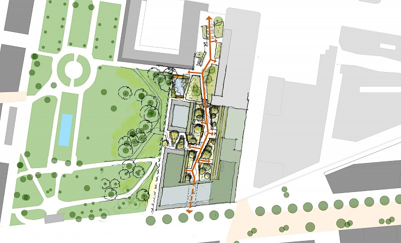 Mit der Öffnung des Parkes für die städtischen Besucher*innen gewinnt die Stadt Luxemburg einen erheblichen Grünraum inmiten der Innenstadt zurück. Zudem stellt dieser Park die „grüne Mitte“ des neu entstehenden Quartiers dar und besitzt daher eine wichtige freiräumliche Funktion und Qualität für das Quartier. Der angrenzende Neubau tritt daher im direkten Dialog zum Park, öffnet sich diesem, schafft Blickbezüge in- und außerhalb des Gebäudes und überträgt dessen grüne Landschaft auf die Fassade des Neubaus.