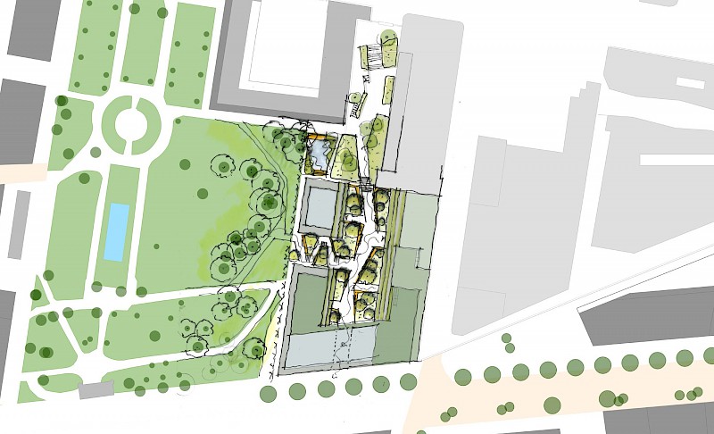 Die Einbettung des Außenraums in die vorhandene Bestandsstruktur, sowie dessen Wechselwirkung war ein leitendes Motiv bei der Gestaltung der Außenanlagen. So adaptiert der Innenhof des Neubaus mit den Strukturen der Schollen die schon bestehende Außenraumgestaltung des Landewyckareals und führt diese fort. Die sogenannten Schollen sind dabei begrünte Inseln innerhalb des Hofes, die Wege- & Blickbeziehungen zwischen den einzelnen Nutzungen stärken und fördern. Durch intensive Begrünung, mittels Stauden und mehrstämmige Gehölze, sollen die grünen Inseln Räume zum Verweilen darstellen und zur Klimaresilienz beitragen. Die Schollen entwickeln sich dabei aus der leichten Topographie des Innenhofs Richtung Landewyckareal heraus und dienen zudem als Sitzelemente für die Besucher*innen des Innenhofes. Angrenzend zu den Nachbargrundstücken terrassiert sich der Aussenbereich herab und lässt kleine Balkone und Terrassen entstehen die durch Bespielungen des Raumes (Spielplatz, Gemeinschaftsraum) ein generationsübergreifendes Miteinander fördert und den Hof als Gemeinschaftsbereich zelebrieren. Eine Durchmischung der Nutzergruppen zwischen Park und Anwohner wird mittels einer natürlichen Barriere durch Gräserbänder vermieden.