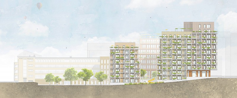 Die Sichtbarkeit und Präsenz des Landewyck-Gebäudes in der Innenstadt von Luxemburg, entlang der Rue de Hollerich ist dem Bauwerk nicht abzustreiten. Vom Hauptbahnhof kommend dient das Landewyck-Gebäude als bauliche Landmarke und Orientierungspunkt innerhalb der Stadt und kann unter anderem als „Tor zur Stadt“ verstanden werden. Diesen Charakter der Landmarke gilt es nun mit einem Pendant auf die andere Seite, entlang der Rue de l’Industrie zu bringen. Der zehn geschossige Neubau schmiegt sich mit der gestaffelten Kubatur an die Bestandshöhe des Landewyck-Gebäudes an und bildet durch die städtebauliche Setzung die Einleitung zur neuen Quartiersmitte und dem angrenzenden Grünraum. Der südliche Neubau bildet somit das Tor zum Park.