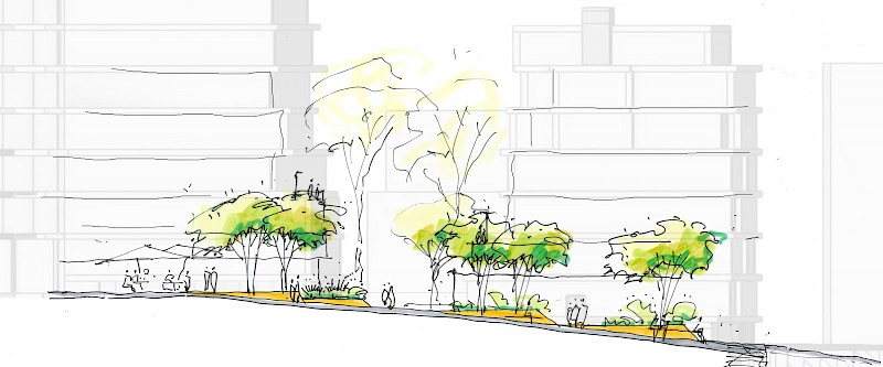 Der Klimawandel und die damit einhergehenden Folgen der Extremwetterereignisse sind nun auch in Mitteleuropa spürbar. Der verantwortungsvolle Umgang mit der Situation wird daher eine immer größere Rolle zugeschrieben. Baumneupflanzungen, ein hoher Grad an Begrünung und versickerungsfähigen Oberflächen, sowie der verantwortungsvolle Umgang mit Niederschlagswasser sind dabei essentielle Punkte, die der Klimaresilienz Beitrag leisten. Im Sinne einer Schwammstadt sollen daher große versickerungsfähige Bereiche ausgebildet werden, die an heißen Tagen die Umgebung durch ihre Verdunstung natürlich kühlen. Ein offenes Retentionsbecken im Norden des Gebäudes soll als wechselfeuchte Zone ausgebildet werden und mit Sitzstufen und Stege als „kleine Oase“ ein Aufenthaltsbereich direkt im Grünen darbieten. Eine nördliche bauliche Verbindung verbindet das Retentionsbecken mit dem Innenhof. Via Kaskadensystem soll überschüssiges Oberflächenwasser in Rigolensystemen und Zisterne zwischengespeichert werden. Zudem gibt es im Untergeschoss noch ein Regenrückhaltebehälter mit einem Fassungsvolumen von 200m³.