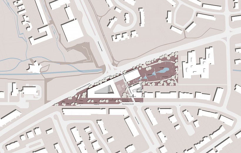 Die Place Winston Churchill, die einseitig 5-geschossig bebaut ist, wird nun auf der gegenüberliegenden Straßenseite mit dem neuen Schulgebäude und einer vorgelagerten Baumreihe begrenzt und räumlich gefasst, so dass hier ein erlebbarer Straßen- und Stadtraum gebildet. Durch eine Verkehrsberuhigung der Place Winston Churchill beispielsweise durch die Ausgestaltung eines Shared-Space-Bereichs kann ein weiterer Mehrwert für diesen Wohnbereich geschaffen werden.Der neue Schulkomplex auf dem aktuell unbebauten Grundstück gibt dem Stadtviertel einen neuen Abschluss entlang des Boulevard Grande-Duchesse Charlotte und schafft damit eine neue städtebauliche Qualität für das Quartier.