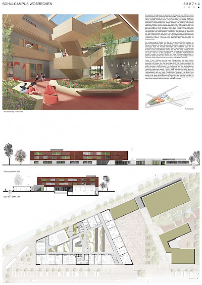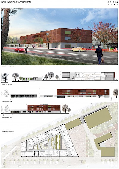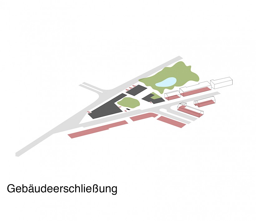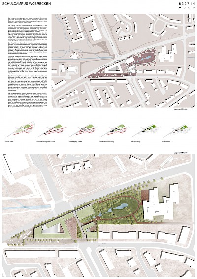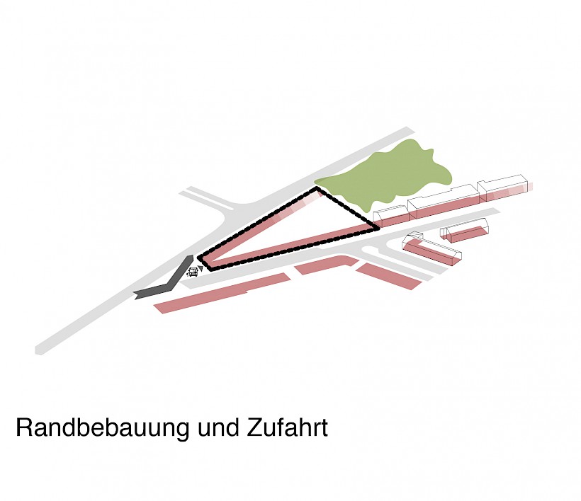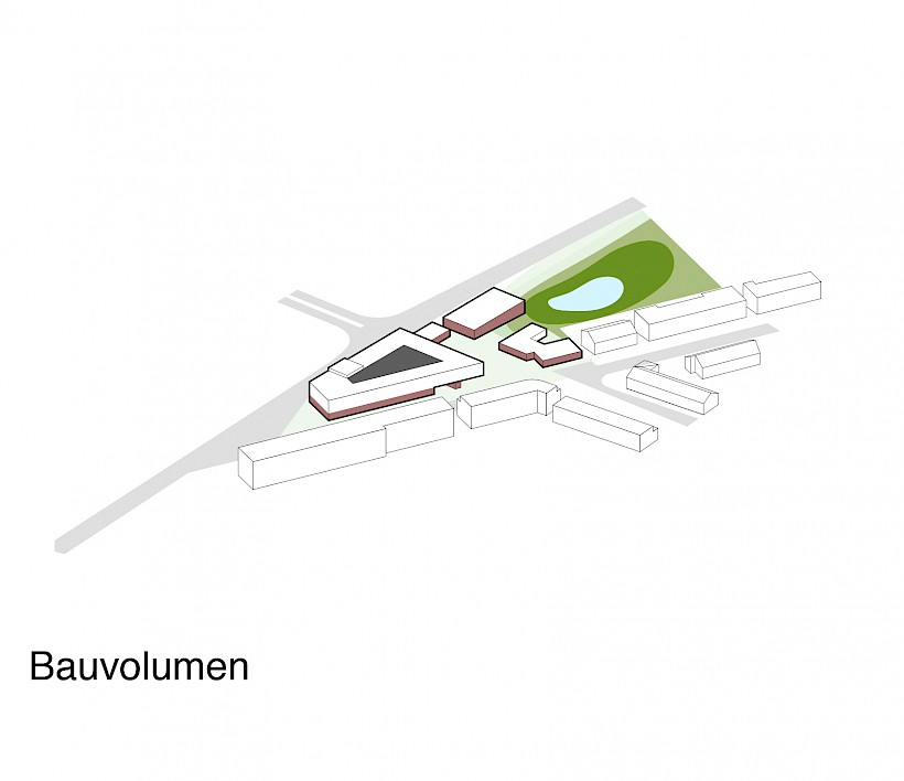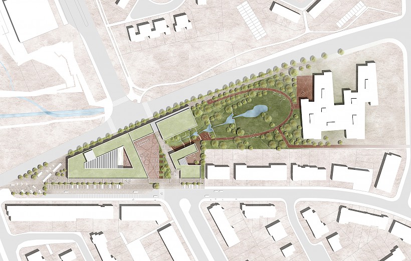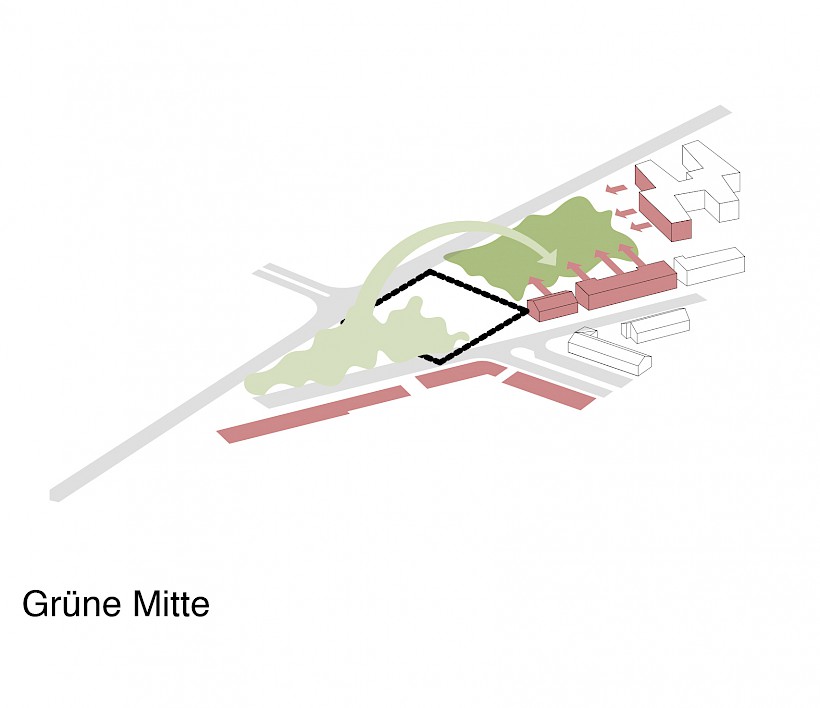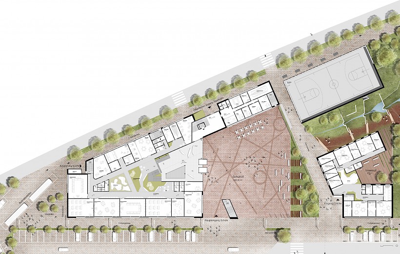 Der Entwurf sieht eine Konzentration der bebauten Fläche auf der vorderen Grundstücksspitze vor, um dadurch zwischen dem neuen Schulkomplex und dem geplanten Pflegeheim eine großzügige, zusammenhängende und öffentlich zugängliche Parkfläche mit hoher Aufenthaltsqualität für alle Anwohner zu schaffen. Die neuen Gebäude führen die Straßenbebauung des Bvd. W. Churchill weiter und nehmen gleichzeitig die Baufluchten der Rue Henri Dunant mit der Positionierung des Ostflügels der neuen Schule auf. Die Achse der Rue Henri Dunant und der Pénétrante de Lankelz bleibt durch den Einschnitt im Bauvolumen und die Verlängerung der Fußwegeverbindung erhalten.