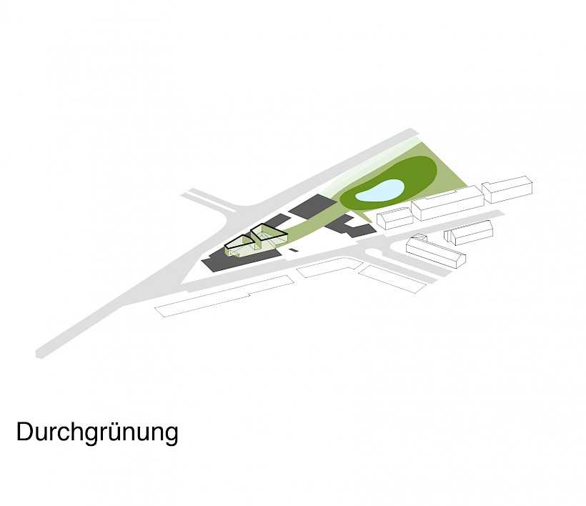 Die Renaturierung der Dippach bleibt bei diesem Konzept möglich, scheint aber bedingt durch die Verortung des neuen Pflegeheims in dieser Konstellation eher unwahrscheinlich und insbesondere in Anbetracht des tief liegenden Niveaus der Dipbech nicht realistisch. Deshalb wird vorgeschlagen, in der neuen Parkgestaltung das Element Wasser neu zu interpretieren und dazu die notwendigen Retentionsflächen des Regenwassers von Schulcampus und Pflegeheim hier miteinzubeziehen. Der Park bietet für die Schule sowie für das Altenheim viele Nutzungsmöglichkeiten im teilweise gewachsenen Freiraum.