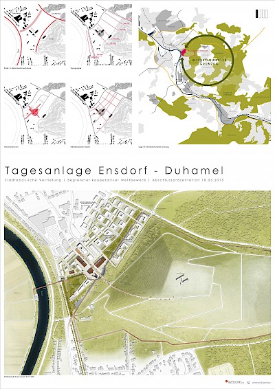 Im Saarlouiser Becken ist die Halde des Bergwerks Duhamel weithin sichtbare Landmarke. Sie überragt in ihrer Erscheinung in alle Richtungen den Horizont der natürlichen Hügel, die das aufgeweitete Saartal begrenzen. Dagegen ist die Tagesanlage an ihrem Fuße weitestgehend terra incognita im Bewusstsein derer, die nicht selbst direkt oder indirekt im Bergwerk beschäftigt waren. Erhebt man sich beim Anstieg auf die Halde über die Dächer der Siedlungsquartiere von Ensdorf und das wilde Gewerbegebiet im Saarlouiser Osten, so wird mit jedem Höhenmeter deutlicher, dass im sichtbaren Umfeld die bedeutendsten Industrie- und Gewerbestandorte in greifbarer Nähe liegen: Kraftwerk Ensdorf, Chemieplattform Karling, Industriegebiet Lisdorfer Berg, Dillinger Hütte, Fordwerke, um die wichtigsten zu nennen. Somit relativiert sich die Bedeutung der Flächen der Tagesanlage für die Entwicklung eines Gewerbestandortes, dessen Größendimension und Nutzungsdichte. Gleichzeitig wird aber klar, dass die zentrale Lage in guter Nachbarschaft mit hervorragender Erschließung die einzige Chance ist, am Standort Duhamel ein qualitatives Alleinstellungsmerkmal zu entwickeln, was sich in der Konkurrenz der Flächenangebote behaupten kann. Entscheidende Kriterien für eine prosperierende Standortentwicklung sind deshalb nicht Quantität und Dichte, sondern vielmehr die Chance zur wirtschaftlichen Vernetzung in der Nachbarschaft, die städtebaulich-qualitative Ausprägung des Standortes und die Identität des Ortes, die nicht zuletzt durch die denkmalgeschützten baulichen Relikte der Tagesanlage gegeben ist.