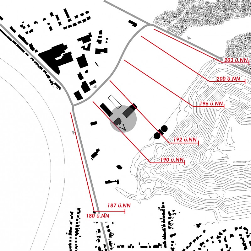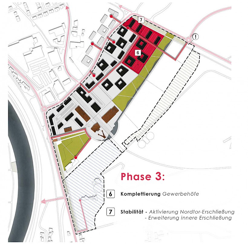 Überlagert man die ansteigenden Höhenlinien mit potentiellen und real vorhandenen Erschließungsachsen, so bildet sich ein Gitternetz, welches ein naheliegendes Erschließungsraster vorzeichnet. Ausgehend von diesem Raster, welches sich vom Kern der Anlage nach Nord-Ost entwickelt, werden untenstehende Entwicklungsbereiche definiert und zu Nutzungsclustern zusammengefasst. Diese werden modular der Reihe nach ausgebaut und abschnittsweise nur soweit erschlossen, wie es der Ansiedlungsdruck erfordert. Nicht genutzte Flächen bleiben als extensive Interimsgrünflächen langfristig erhalten.