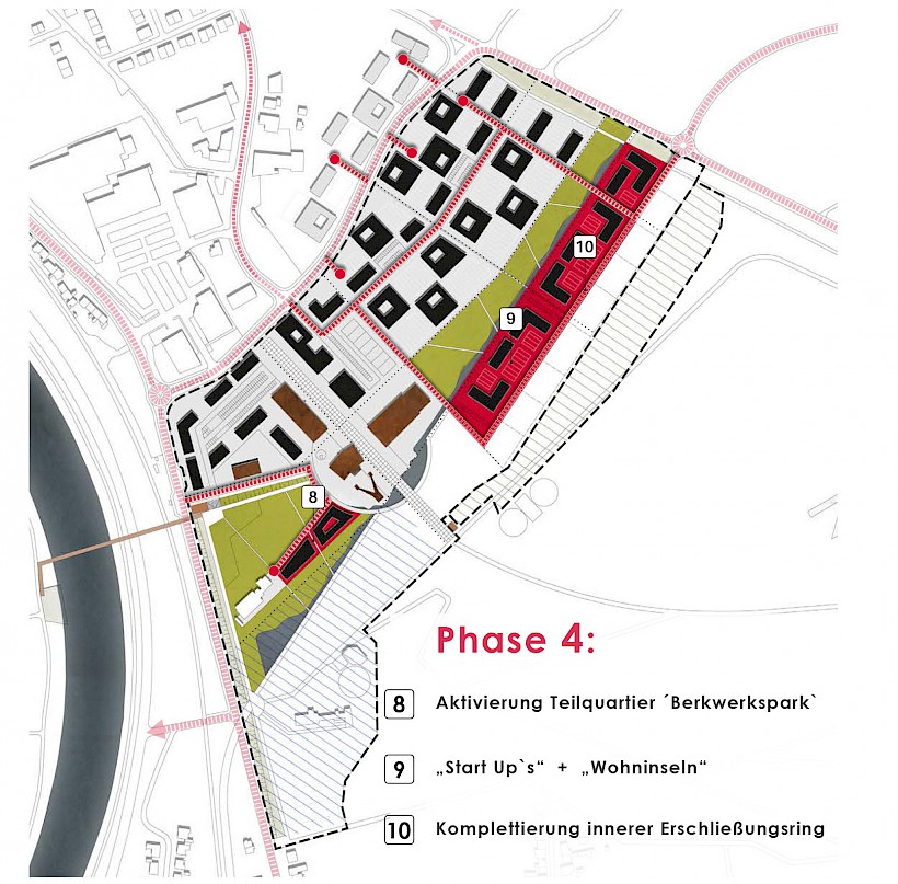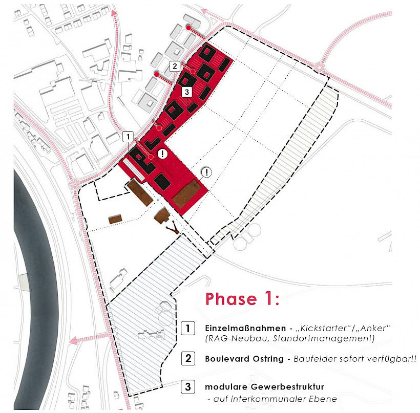 Der Ostring soll von der B51 Alt bis zur Einbiegung in die L 343 als Stadtstraße klassifiziert und mit den notwendigen Ein- Ausfahrtmöglichkeiten ausgebaut werden. Im Feld der Kohlelagerflächen wird auf der Achse der vorhandenen Fahrbahn die neue innere Erschließung ausgebaut. In einer letzten Ausbauphase wird das Quartier „Startup- und Wohninseln“ mit einer eigenen Achse am Haldenfuß erschlossen. Erweiterungsflächen in Richtung Haldenfuß wären möglich.