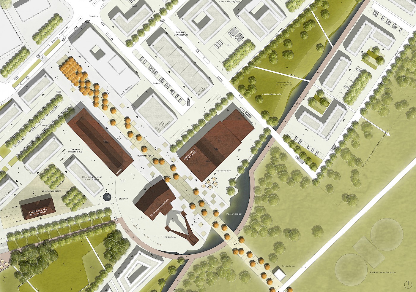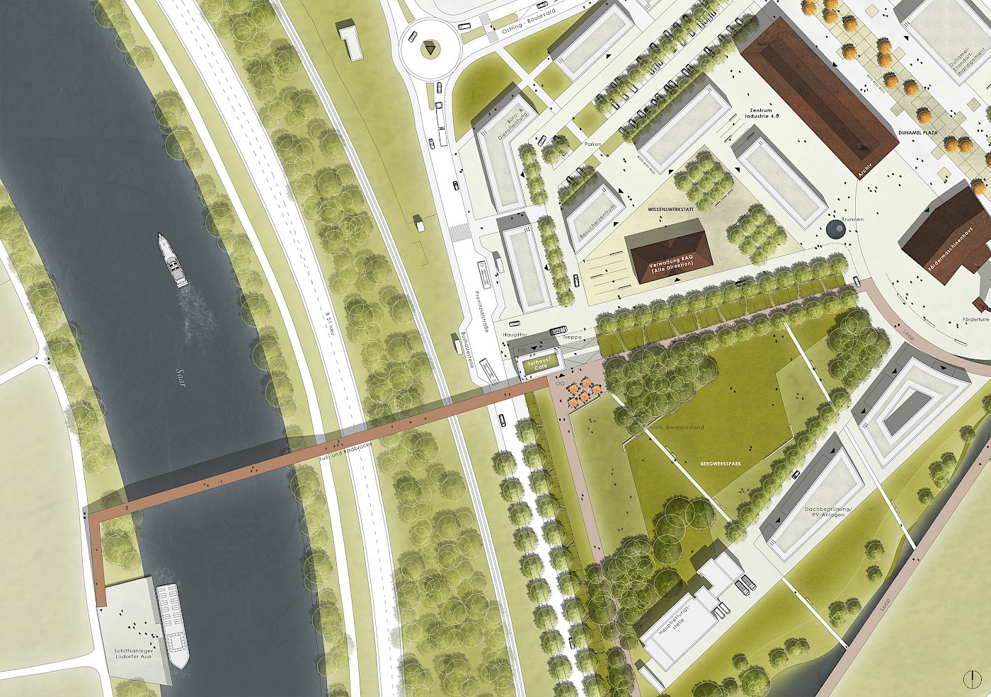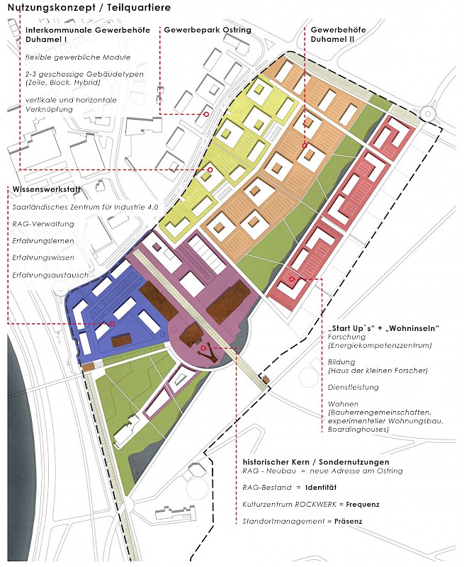 Der Nukleus des Areals, der historische Kern inkl. RAG-Neubau, wird durch eine zentrale Plaza erschlossen, an welche in Verlängerung der Haldenaufstieg anschließt. Im nördlichen Bereich des Planungsgebietes schaffen die Gewerbehöfe Duhamel eine angemessene Nutzungsdichte durch die wechselständige Stellung, die entstehenden freien Flächen können in Abhängigkeit der sich ansiedelnden Gewerbe entwickelt werden. Die stärker verdichtete Süd-westliche Wissenwerkstatt kann als Aus- und Weiterbildungscluster der Industrieunternehmen der Region etabliert werden, am dortigen Haupteingang zum Gelände fungiert das Torhaus als Anlaufpunkt und Brückenkopf mit Sondernutzung und Cafe am Bergwerkspark. Dieser stellt sich als öffentlicher Park mit extensiver Pflege dar; Rasenflächen und Großbäume, unter Einbeziehung vorhandener Baumgruppen, dienen als grüner Erholungsraum für Beschäftigte und Anwohner. Über das Wasserband und den Loop ist der Park mit der grünen Mitte bzw. den Campusterrassen verbunden, welcher als gliedernder Grünzug im Quartier ein wichtiger Baustein im interkommunalen Grünzug ist sein kann. Extensive Begrünung paart sich hier mit der naturnahen Wasserachse mit Zwischenstaus und fußläufige Wegeachsen vernetzen die Quartiere über den Park hinweg. Um die vorhandenen Freizeitfunktionen der angrenzenden Wald- und Haldenflächen zu stützen, wird entlang der Grün- und Wasserachsen der Haldenrundweg, der sog. Loop geschlossen. Damit wird das Wegenetzt zu den Wohnquartieren von Ensdorf, zum Erholungsgebiet Lachwald und zum Interkommunalen Grünzug insgesamt ideal ergänzt. Die Fußgängerbrücke über Bahn, B51 und Saar wäre eine ideale Ergänzung, um Wege nach Saarlouis-Innenstadt zu verkürzen und an den Saar-Rad-Wanderweg anzuknüpfen.
