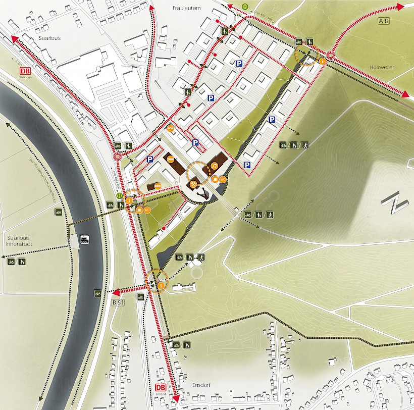 Um die vorhandenen Freizeitfunktionen der angrenzenden Wald- und Haldenflächen zu stützen, wird entlang der Grün- und Wasserachsen der Haldenrundweg, der sog. Loop geschlossen. Damit wird das Wegenetzt zu den Wohnquartieren von Ensdorf, zum Erholungsgebiet Lachwald und zum Interkommunalen Grünzug insgesamt ideal ergänzt. Ein schneller Fuß- und Radweg führt über aufgelassene Gleistrassen Richtung Ensdorf-Bahnhof. Die Fußgängerbrücke über Bahn, B51 und Saar wäre eine ideale Ergänzung, um Wege nach Saarlouis-Innenstadt zu verkürzen und an den Saar-Rad-Wanderweg anzuknüpfen. Dieser würde die Freizeitfunktion der Halde wiederum stützen. Jedoch ist das städtebauliche Konzept zur Entwicklung der Tagesanlage nicht abhängig von der Realisierung der Brücke.
