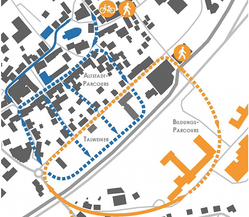 Stadtbezug - Der Talweiher muss im städtebaulichen Kontext, zwischen Altstadt und Bildungseinrichtungen, betrachtet werden. Wichtige Wegeverbindungen werden zum Schulparcours bzw. Altstadtparcours zusammengefasst.
