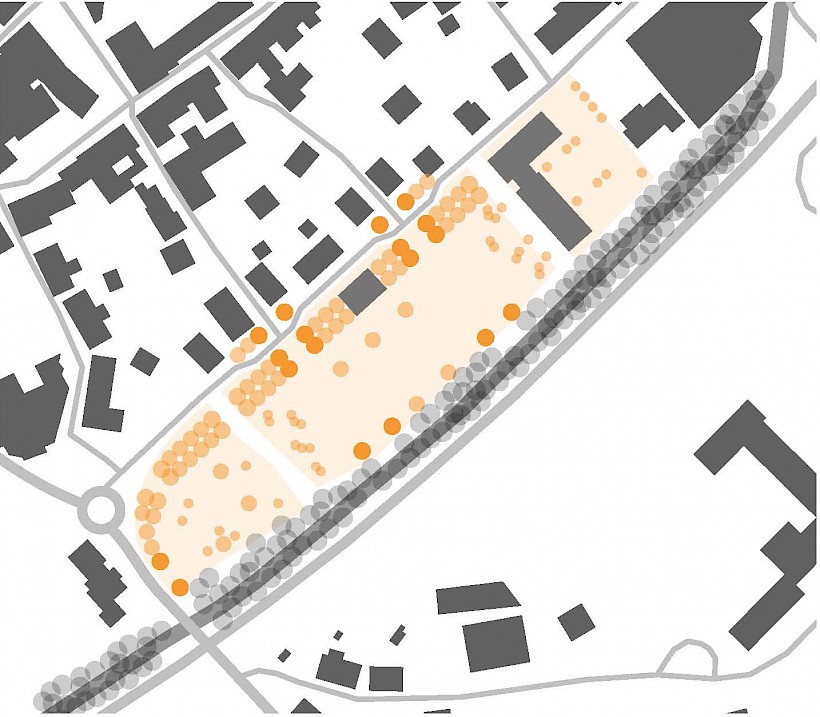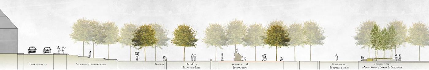 Vegetation – Der Platzrahmen wird zusätzlich durch Baumachsen betont. Baumtore markieren die Ein- und Übergänge zwischen der Altstadt und dem Talweiherplatz. „Birkenfelder“ als begrünte Schollen dienen als Filter entlang der Raumfolge.