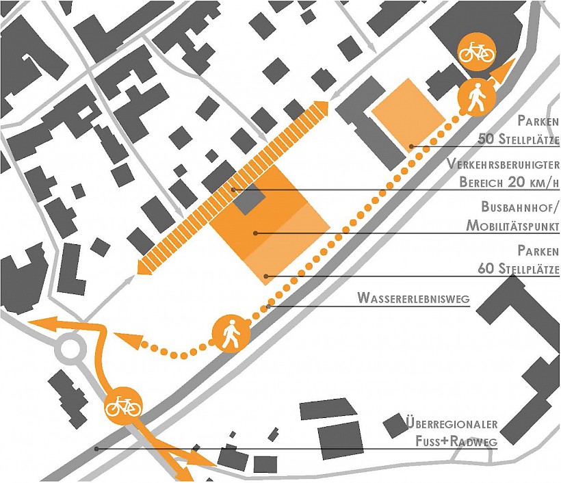 Verkehr – Die Straße ‚Am Talweiher‘ wird im Bereich des Platzes zu einer verkehrsberuhigten Zone umgebaut. Der Mobilitätsknotenpunkt wird mit den Funktionen Tourismus und Information verbunden.