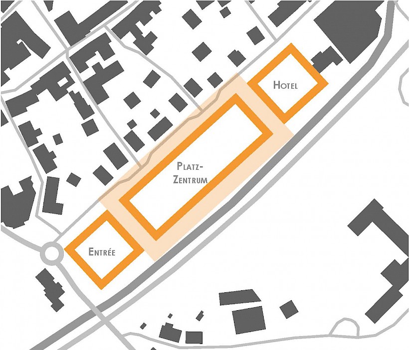 Raumfolge - Der Platzraum wird in ein Platzzentrum und zwei flankierende Bereiche gegliedert. Zum neuen Kreisverkehr entsteht die Eingangssituation, das parkähnliche Entrée. Auf der Ostseite wird der neue Hotelkomplex als Raumkante platziert.