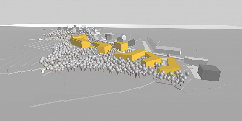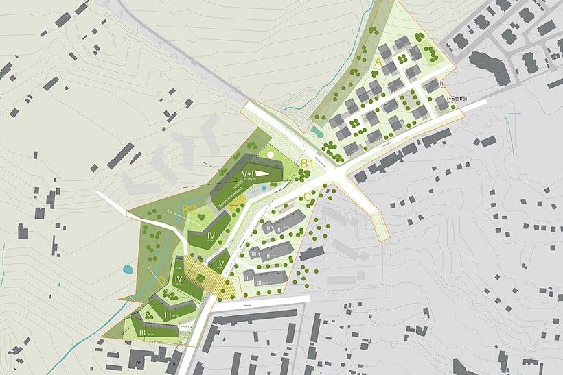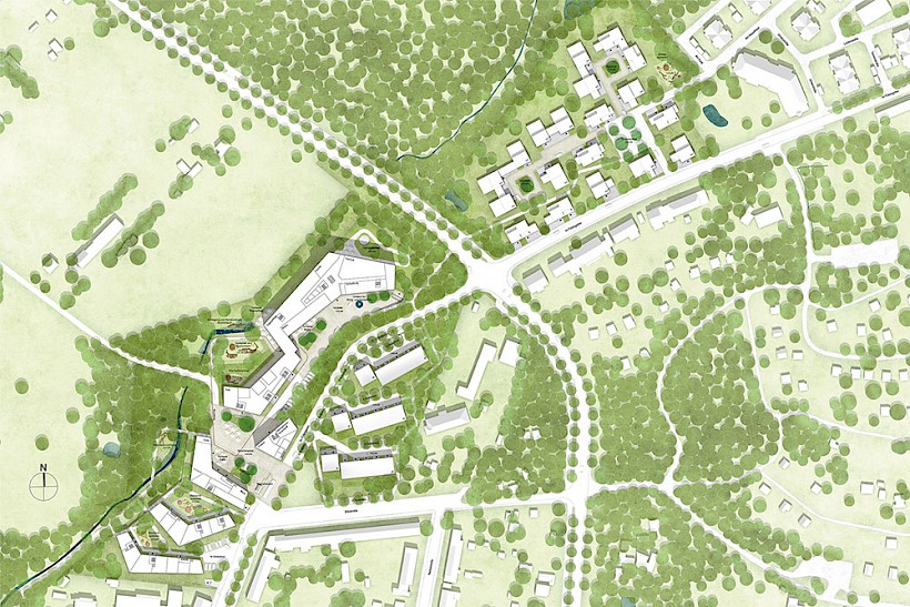 Die Freianlagen werden von der neuen Bebauung mit offenen Armen empfangen. Wie ein Fluss fließt die Landschaft in die Zwischenbereiche der Gebäude und sorgt so für eine starke Durchgrünung. Bestehende Vegetationsstrukturen, wie die Bewaldung um den Güchenbach werden aufgenommen und mit heimischen Gehölzen ergänzt, punktuell auch ausgelichtet. Der Bachlauf wird in mehreren Teilen freigestellt, Aufenthaltsqualität geschaffen und das Wasser erlebbar gemacht. Der Gegenpol zur beruhigenden Gewässerlandschaft wird durch den zentralen Quartiersplatz geschaffen. Eingefasst von Kita, Café und Mehrgenerationentreff bildet er den Mittelpunkt der Quartiersgemeinschaft und einen Treffpunkt für Jung und Alt. Die zentralen Außenanlagen des Quartiers, also Quartiersplatz, Kinderspielplatz und die Vorfläche des Seniorenheims werden über einen Rundweg verknüpft.
