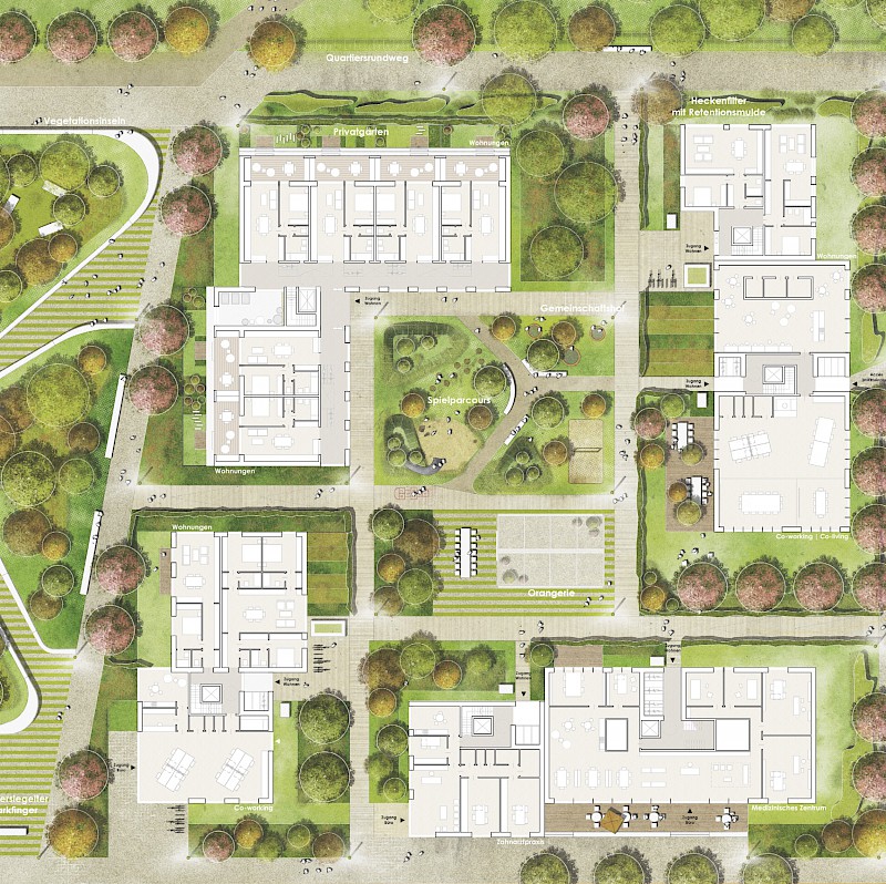- Halböffentliche Gemeinschaftshöfe im Innern der Ilots mit unterschiedlichem Nutzungsangebot (z.B. Gewächshäuser, überdachter Spielplatz, Café des enfants, Bühne, Nachbarschaftstreff etc.).