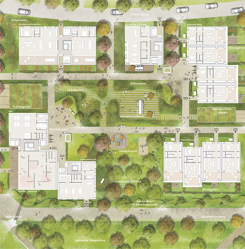 - Quartiersidentität durch die gemeinschaftliche grüne Mitte und den Quartiersplatz mit seinen umliegenden Nutzungen.