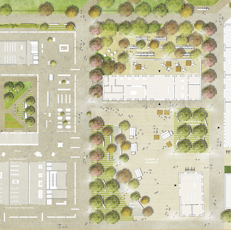- Zentraler Quartiersplatz, der über einen Biergarten mit dem Quartierspark verbunden ist.